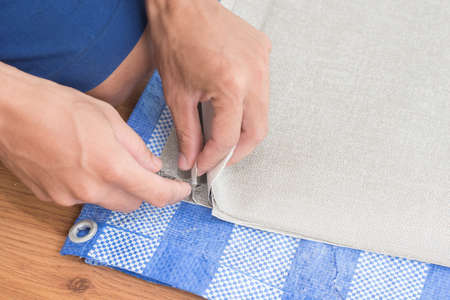 Seat upholstery in a furniture workshop, eco-leather cover, close-up