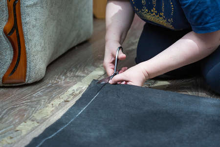 Woman's hand cuts black covering material on the floor in the house with scissors