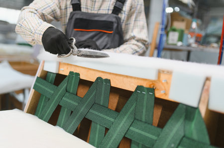 Craftsman working diligently on a sofa in a furniture factory, using scissors and various tools to create high quality upholstery