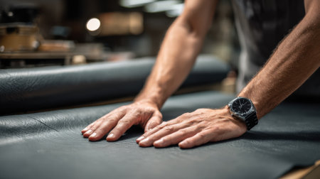 Medium shot of a technician performing a manual pull test on leather assessing its elasticity with focused hands stretching the material over a table.