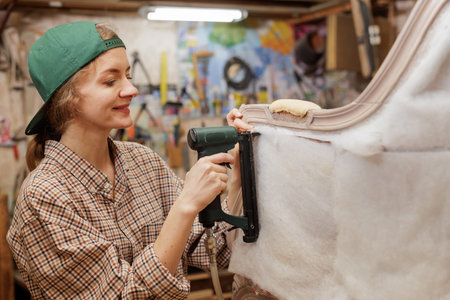 Young woman in workshop restoring old furniture by upholstering armchair replacing fabric to give fresh look focusing on craftsmanship and detail in refurbishment process. Copy space