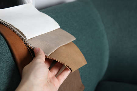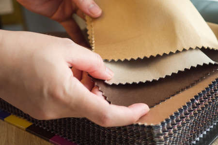 Choosing upholstery fabric color and texture from various colorful samples in a store. Female customer hands touching textile.