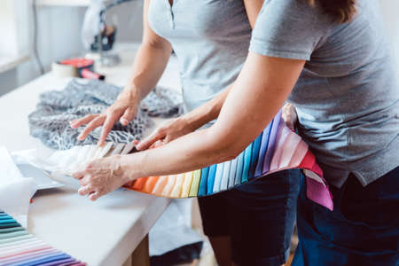 Close-up of designers of interior working at the table with samples they choosing the suitable color