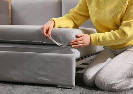 Young woman unfolding sofa into a bed in room, closeup. modern interior