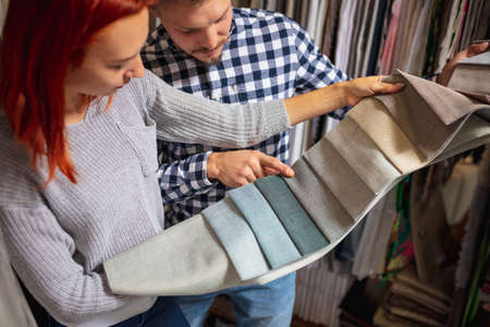 Palette. Couple choosing textile at home decoration store, shop. Making of home interior design during quarantine. Happy man and woman, young family look dreamful, cheerful choosing materials.