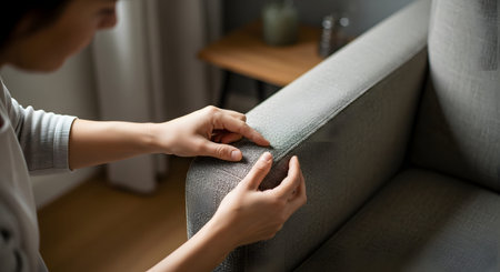 Close-up of a person's hands touching and inspecting the textured grey fabric of a sofa armrest. The image focuses on furniture quality, cleaning, or the tactile experience of home decor materials.
