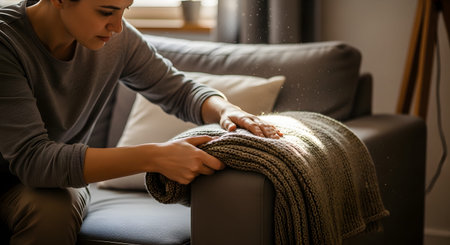 A woman shakes a textured blanket over a sofa, with dust particles visible in the bright sunlight streaming through the window. The image illustrates household cleaning, dust allergies, and maintaining a tidy living space.