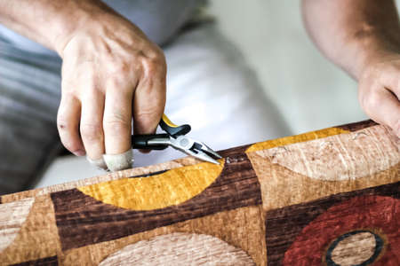 The workflow of restoration of upholstered furniture. Overworked male hands remove the old upholstery from the wooden frame of the sofa. A man, caucasian, works with flat teeth.