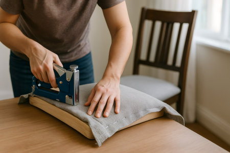 Hands skillfully reupholstering a dining chair seat with a staple gun, showcasing a DIY home improvement project in progress