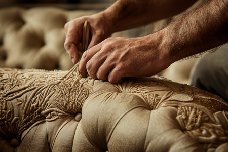 Artisans work diligently in a rustic workshop, meticulously crafting upholstery. The soft golden afternoon light highlights the detailed embroidery as hands skillfully manipulate fabric.