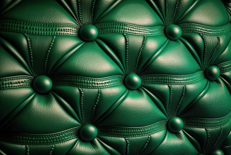 Green velvet capitone textile background, retro Chesterfield style checkered soft tufted fabric furniture diamond pattern decoration with buttons, close up