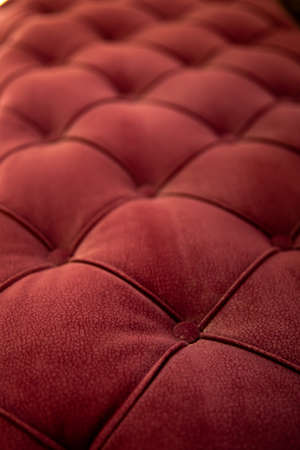Close up textured red velvet fabric modern sofa with sunken buttons. Idea and variant of fabric for upholstery sofa.