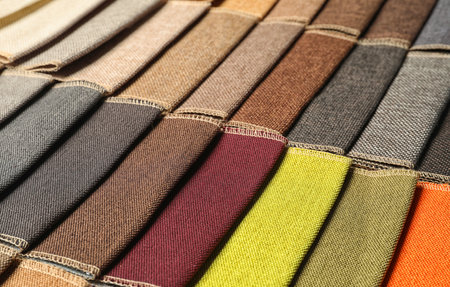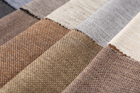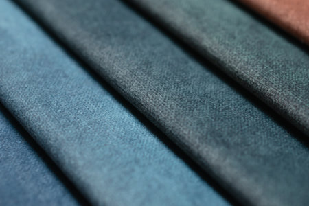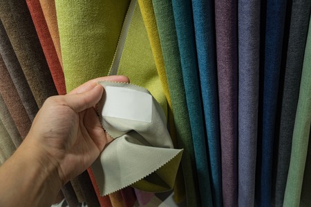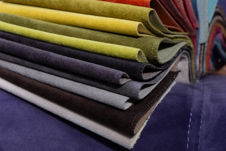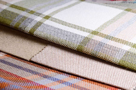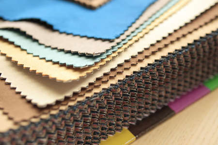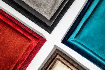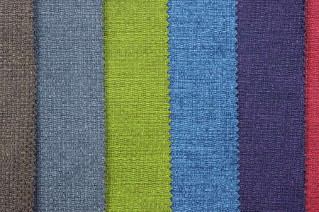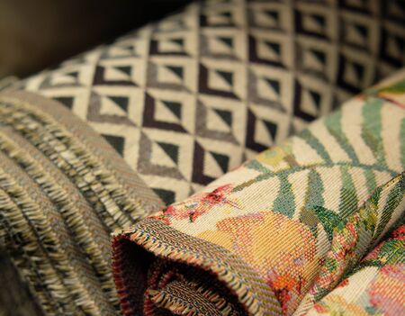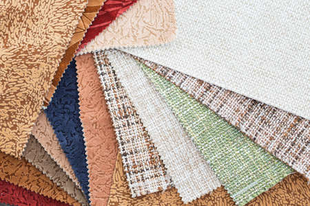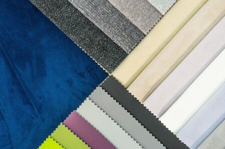 Multi-colored samples of upholstery fabric for sofas and chairs close-up. Selection of fabric for interior decoration