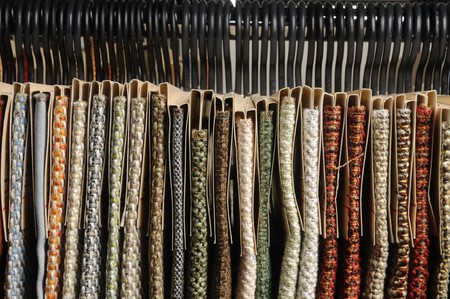 Pieces of textile material for interior trim and furniture making for example in the catalog of different colors for the design studio. Many colored materials hanging on the wall in stock.