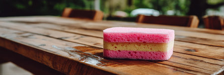A vibrant pink and yellow sponge is placed on a rustic wooden table in an outdoor area. The setting is peaceful and natural, inviting relaxation.