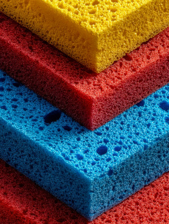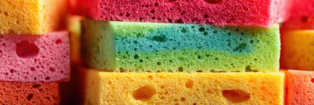Brightly colored sponges in shades of pink, yellow, green, and blue are stacked together, showing their unique textures and patterns, perfect for various uses.