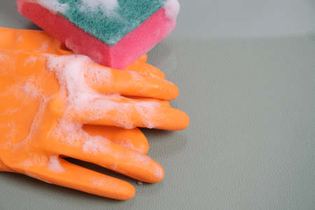 Gloves with a wet sponge for cleaning on glass covered with foam