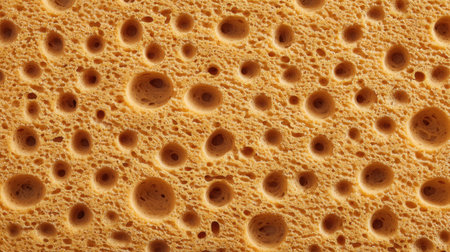 This close-up image showcases a detailed texture of a yellow sponge with distinctive holes and bubbles. Ideal for design, background use, and various creative projects.