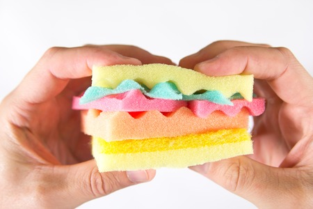 Male hands holding a burger made from sponges. Concept of unhealthy food and non-natural products