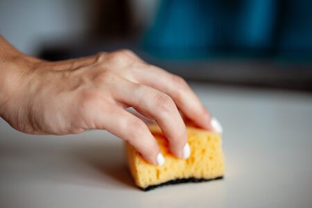 Young woman's hand cleaning white desk with a yellow washcloth. Close up shot of a home cleaning process. Health care during coronavirus and disinfection concept