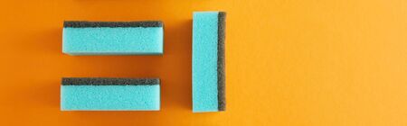 House cleaning sponges on blue, pink, yellow background, copy space. Flat lay or top view. Cleaning service or housekeeping concept with space. Hard shadows in sunlight