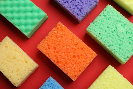Sponges of different colors on a beige background. Top view. Washing and cleaning set.