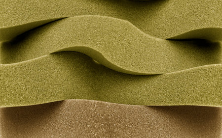 pile of thick foam sheet material stacked crosswise. Beige and brown texture with waves effect.