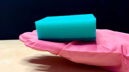 Hand in rubber glove holding yellow sponge. Cleaning service concept. Space for text