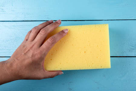 Yellow sponge in a womans hand on a blue painted wooden background. Beautiful and varnished nails