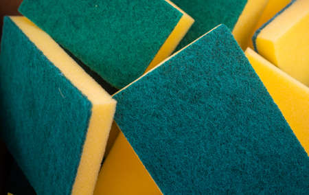 A closeup shot of rectangular yellow sponges with green abrasive sides