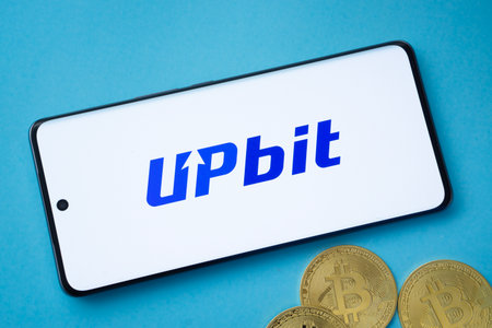Vigo, Spain, November 30, 2025.A human hand holds a smartphone whose screen displays the logo of Upbit, South Korea's largest cryptocurrency exchange by trading volume. The composition is clear, modern, and functional, ideal for content about fintech, blo