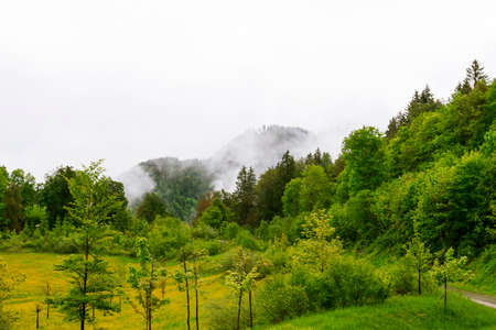 Beautiful mountain forest landscape with mist in trees