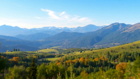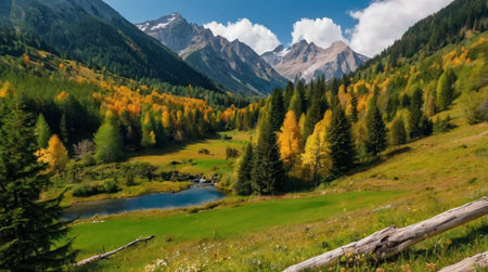 panoramic view of alpine meadow with colorful forest in autumn