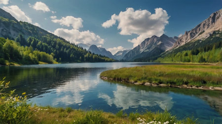 panoramic view of alpine lake with crystal clear water and reflection in water