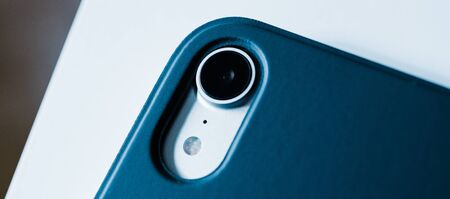 Paris, France - Feb 12, 2019: Wide macro close-up shot of rear camera photo lens of new iPad Pro tablet with protective Smart Folio by Apple Computers - blue color cast