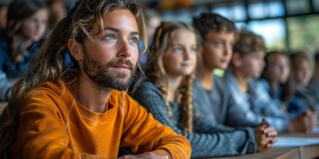 A group of diverse students listens intently in a classroom setting, reflecting their engagement and concern. The background features blurred faces and a neutral backdrop, enhancing focus.