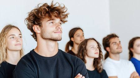A diverse group of young adults gazing upwards with expressions of hope and anticipation.