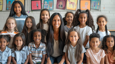 A group portrait of a teacher and her diverse class of elementary school students. - Generative AI.
