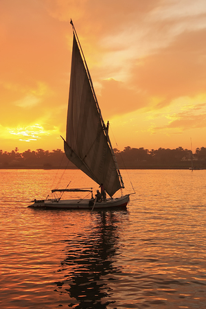 Felucca boat sailing on the Nile river at sunset, Luxor, Egypt