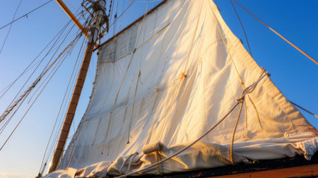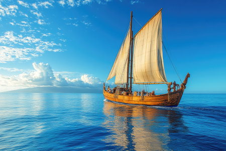 A stunning scene of a classic wooden sailing ship gracefully moving through tranquil waters, surrounded by a picturesque blue sky and soft clouds, evoking a sense of adventure and peace.