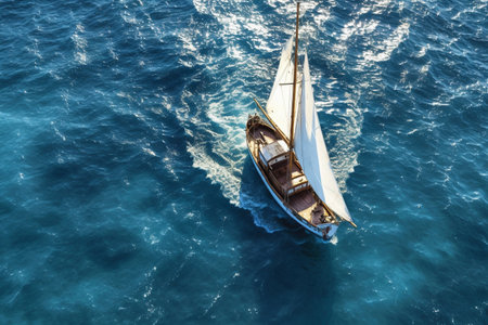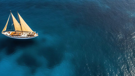 Serene aerial view of a sailboat anchored on flat calm seas during early morning light, showcasing tranquility and natural beauty in open waters