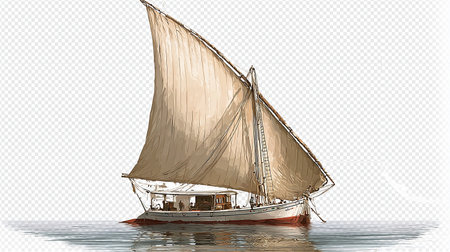 A serene felucca boat glides across calm waters, surrounded by palm trees