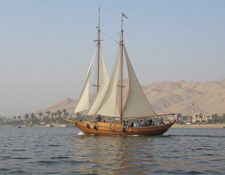See a traditional Nile river felucca, navigating the ancient pharaonic river. This photo shows the timeless beauty of a felucca sailing down the historic river.
