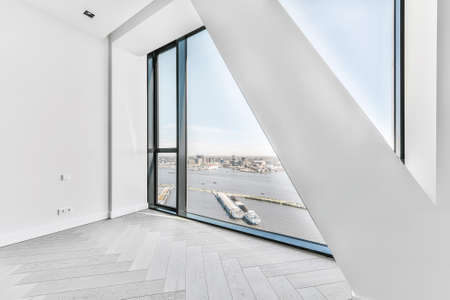Unfurnished room interior with parquet flooring and white walls and wall window in luxury apartment
