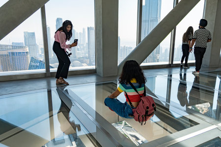 Dubai, UAE , United Arab Emirates. November 28th, 2022. View inside the Sky View skyscraper. Tourists walk on the glass floor and take photos on a beautiful background
