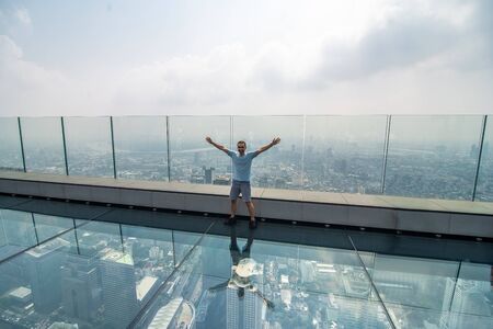 Young man sits on a glass floor on the roof of a King Power Mahanakhon building