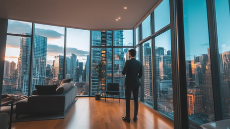 A businessman in a suit observes a vibrant city skyline at dusk from a modern high-rise apartment with panoramic windows