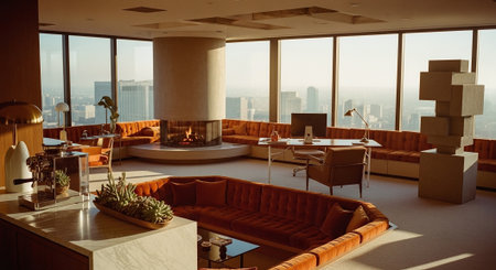Luxury living room interior with panoramic city view.