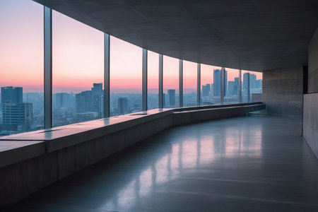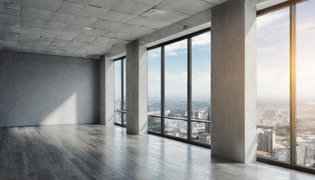 A stunning 3D illustration of an empty modern high-rise interior, showcasing a panoramic city view bathed in daylight, emphasizing clean lines and minimalist decor.