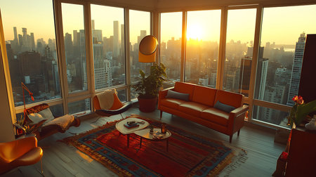 A cozy living room bathed in sunset light showcasing urban skyline views through large windows.